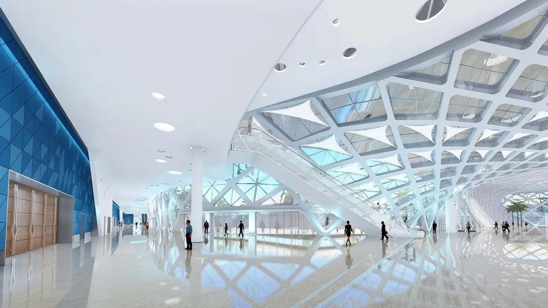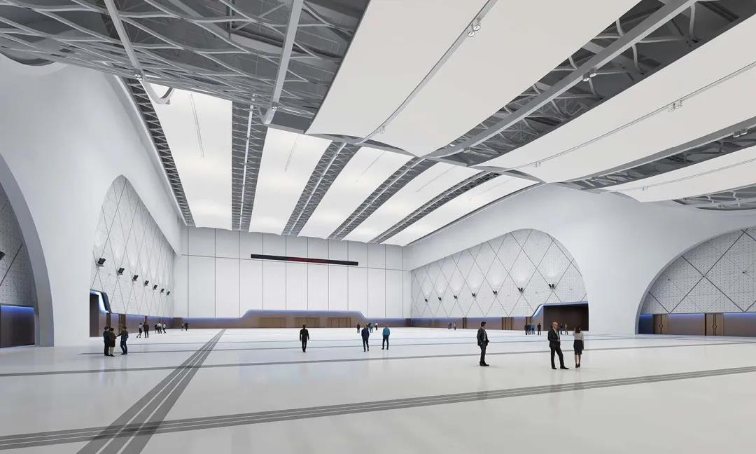 展覽大廳設(shè)計充分利用空間的特征,將兩層巨大的落差變成一個最大特色且和建筑元素相呼應(yīng),以兩翼將高和低空間分成兩個區(qū)域。天花板采用反光膜為空間的主要照明,節(jié)省了空間的能耗,并帶來柔和的主光源。膜天花又像飛翔的翅膀,和建筑飛翔的海鷗形態(tài)相呼應(yīng),墻面、天花嚴(yán)格按聲學(xué)要求設(shè)計。巨型的室內(nèi)空間能有較好的影音效果,整個場景可以滿足高端展示,萬人會議和一些重大活動及演出秀的多重功能。