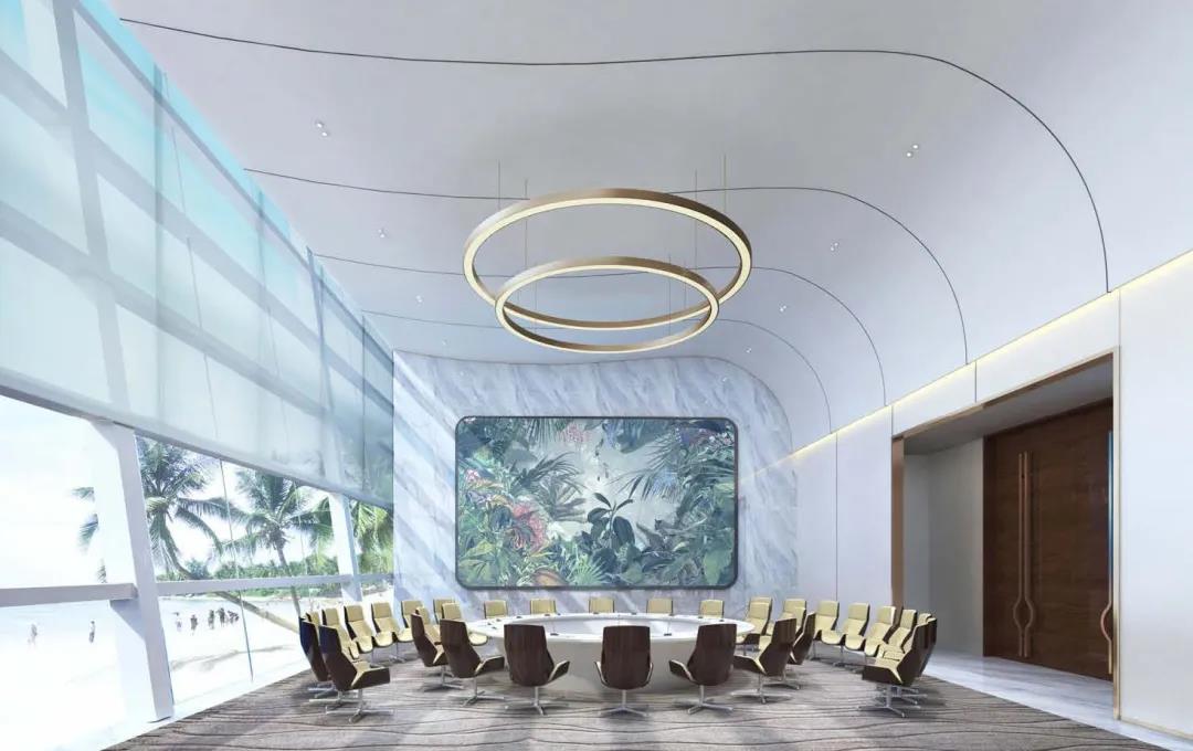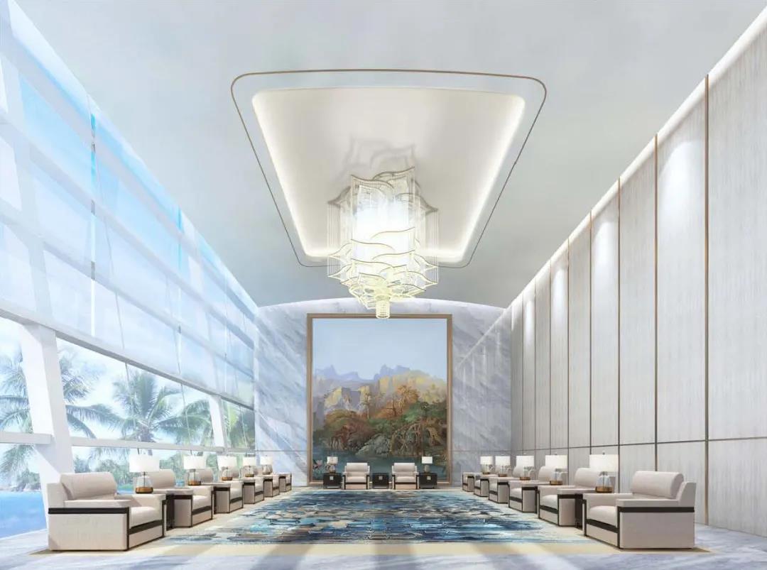 4000多平米的多功能宴會廳設(shè)計,強調(diào)其滿足不同功能的專業(yè)性和品質(zhì)感,尤其作為宴會的氛圍。以揚帆起航騰飛的主題,天花由八塊四組飛翔意向的天花造型組成,將海南省花“三角梅”藝術(shù)燈飾作為宴會廳的天花構(gòu)成。地毯以海為主題,使揚帆起航的內(nèi)涵和主題做一個具有視覺沖擊力的表達(dá)。主宴會廳設(shè)一個300多平米的單個巨幅屏幕,在會議、宴會及婚宴、表演都能有一個具有視覺互動的主背景。