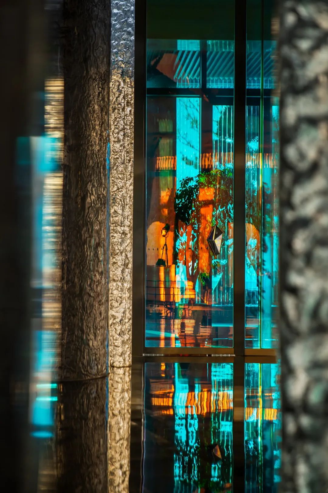 總臺后一叢叢青金石粗糲生長,光河在棱角中沖撞,仿若繪制中的梵高星空,靜謐燃燒宇宙的弦。平滑如鏡的大理石地面,不動聲色地照映萬物,模糊了虛實界限。