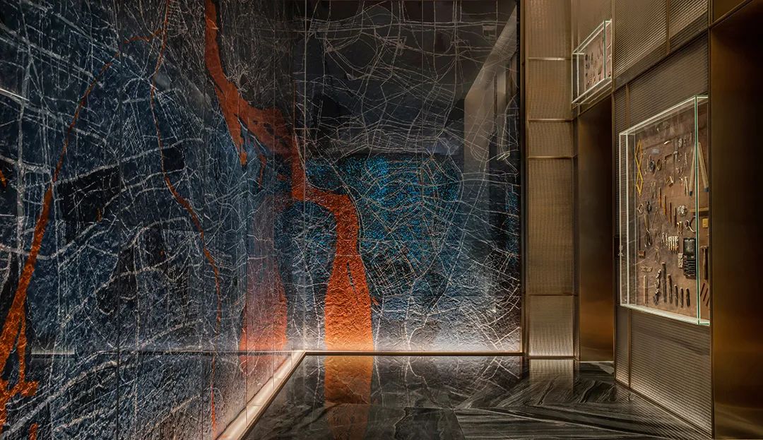 當大地側了個身,將山河走向、地質肌理坦露于墻,送來城市生長變遷的信息,你會不自覺沉迷靜思。常規的宴會電梯廳前,YANG別出心裁引入地形圖譜,激發驚喜。