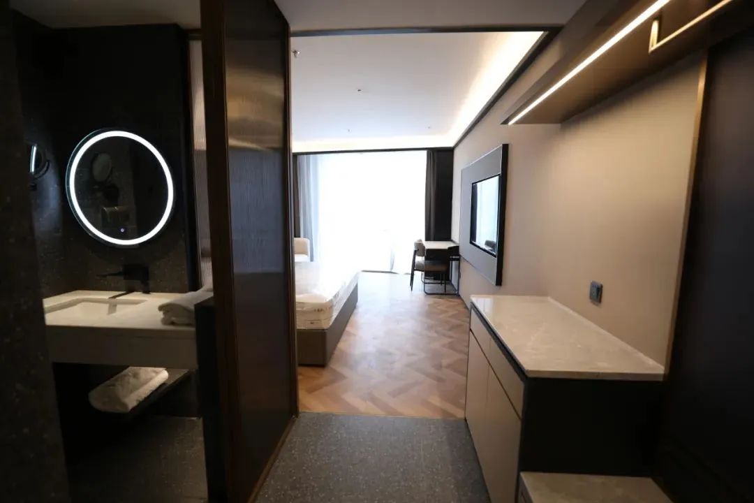 該項目由中建科工及同濟大學建筑設(shè)計研究院以EPC模式承建,采用工廠化生產(chǎn)、裝配式施工、一體化裝修的鋼結(jié)構(gòu)體系。千里馬裝飾集團負責南樓1-3層及北樓10-21層區(qū)域的精裝修工程中所有樓地面、踢腳線、墻面、收口線、天棚吊頂(風口百葉)、隔墻(戶內(nèi)外圍隔墻、分戶隔墻、門洞處隔墻、門洞上方隔墻、戶內(nèi)風井包管、戶內(nèi)包柱隔墻門窗、管井處隔墻)隔斷(門窗基層、衛(wèi)生間及門套、入戶門)、裝飾線條、防火巖棉及燈槽、全身鏡、固定衣柜、窗簾盒等,圖紙顯示配套配電箱末端強電安裝工程(燈具、開關(guān)插座、管線敷設(shè))、從預留給水三通(含接駁)接至用水器具的管道、給水器具和排水器具的施工,施工范圍內(nèi)與其他單位交界的收邊收口等一切所需工作以及范圍內(nèi)門窗工程。由于工期緊張,項目自6月初進場以來,克服了疫情、雨季、高溫以及高空作業(yè)、工期緊等諸多困難,用3個月實現(xiàn)南樓交付,5個月實現(xiàn)全面交付。