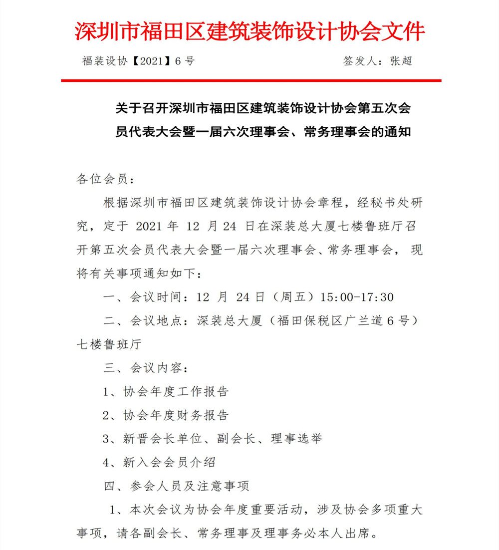 關(guān)于召開深圳市福田區(qū)建筑裝飾設(shè)計(jì)協(xié)會(huì)第五次會(huì)員代表大會(huì)暨一屆六次理事會(huì)、常務(wù)理事會(huì)的通知