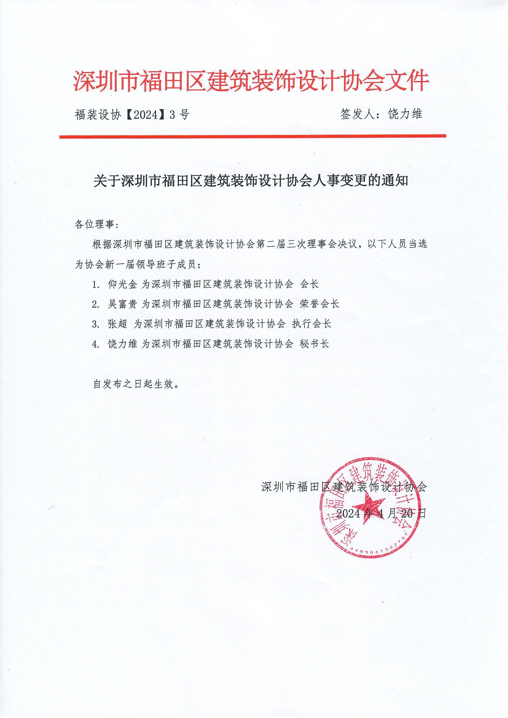 關(guān)于深圳市福田區(qū)建筑裝飾設(shè)計(jì)協(xié)會(huì)人事變更的通知