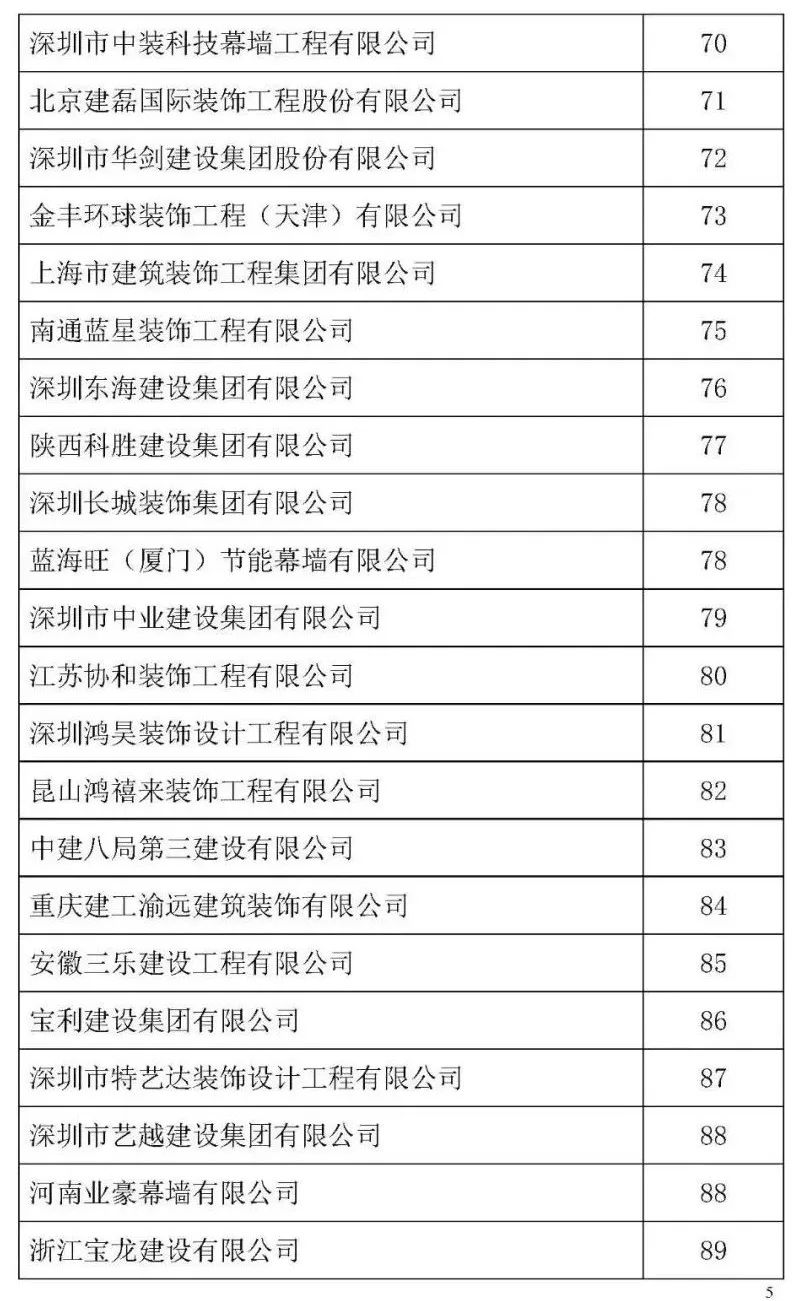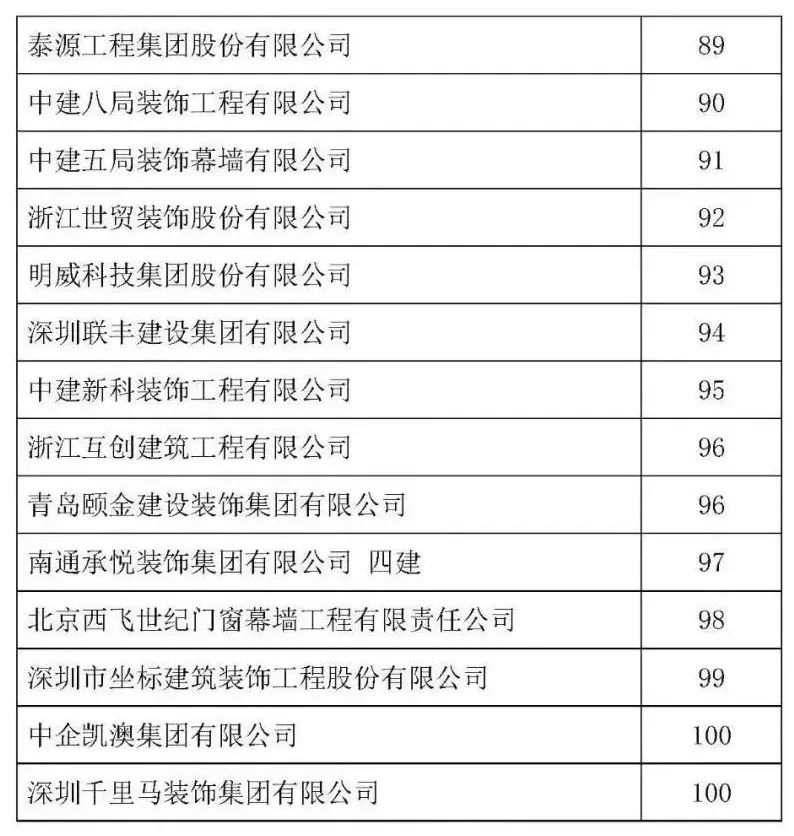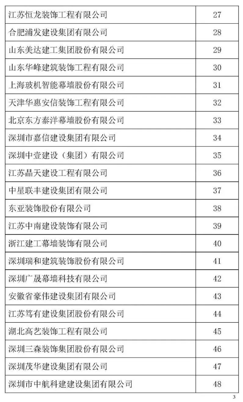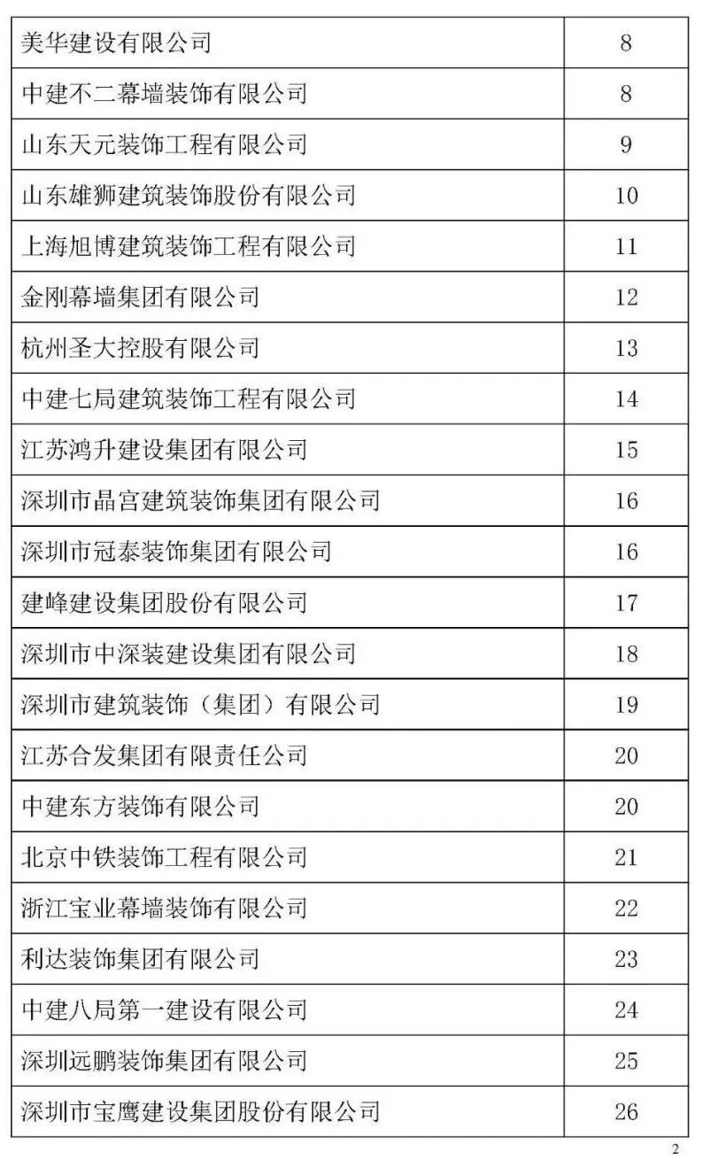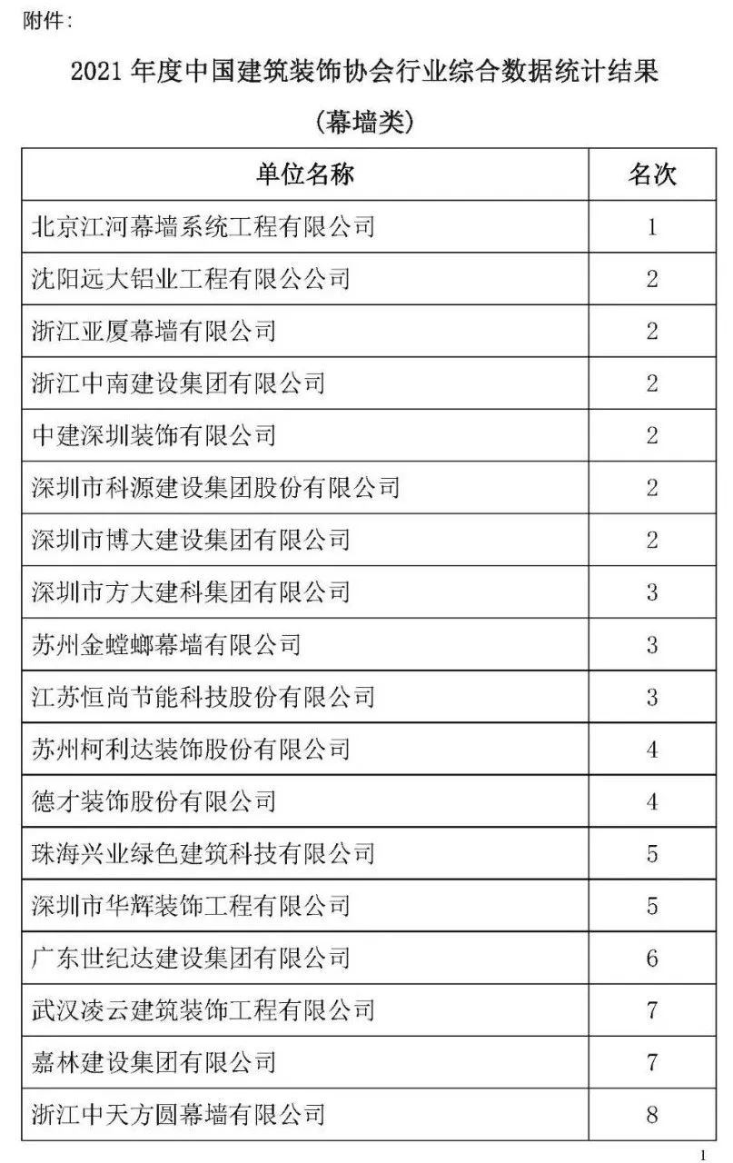 根據(jù)中裝協(xié)《關(guān)于開展2021年度中國(guó)建筑裝飾協(xié)會(huì)行業(yè)綜合數(shù)據(jù)統(tǒng)計(jì)工作的通知》(中裝協(xié) [2022]24號(hào)文件)及文件中所確定的工作原則和統(tǒng)計(jì)規(guī)則, 中國(guó)建筑裝飾協(xié)會(huì)組織開展了2021年度中國(guó)建筑裝飾行業(yè)綜合數(shù)據(jù)統(tǒng)計(jì)工作,此次綜合數(shù)據(jù)統(tǒng)計(jì)工作分為裝飾、幕墻、設(shè)計(jì)、建材四類,現(xiàn)將2021年度中國(guó)建筑裝飾協(xié)會(huì)行業(yè)綜合數(shù)據(jù)統(tǒng)計(jì)幕墻類結(jié)果名單予以公示,公示期7天。